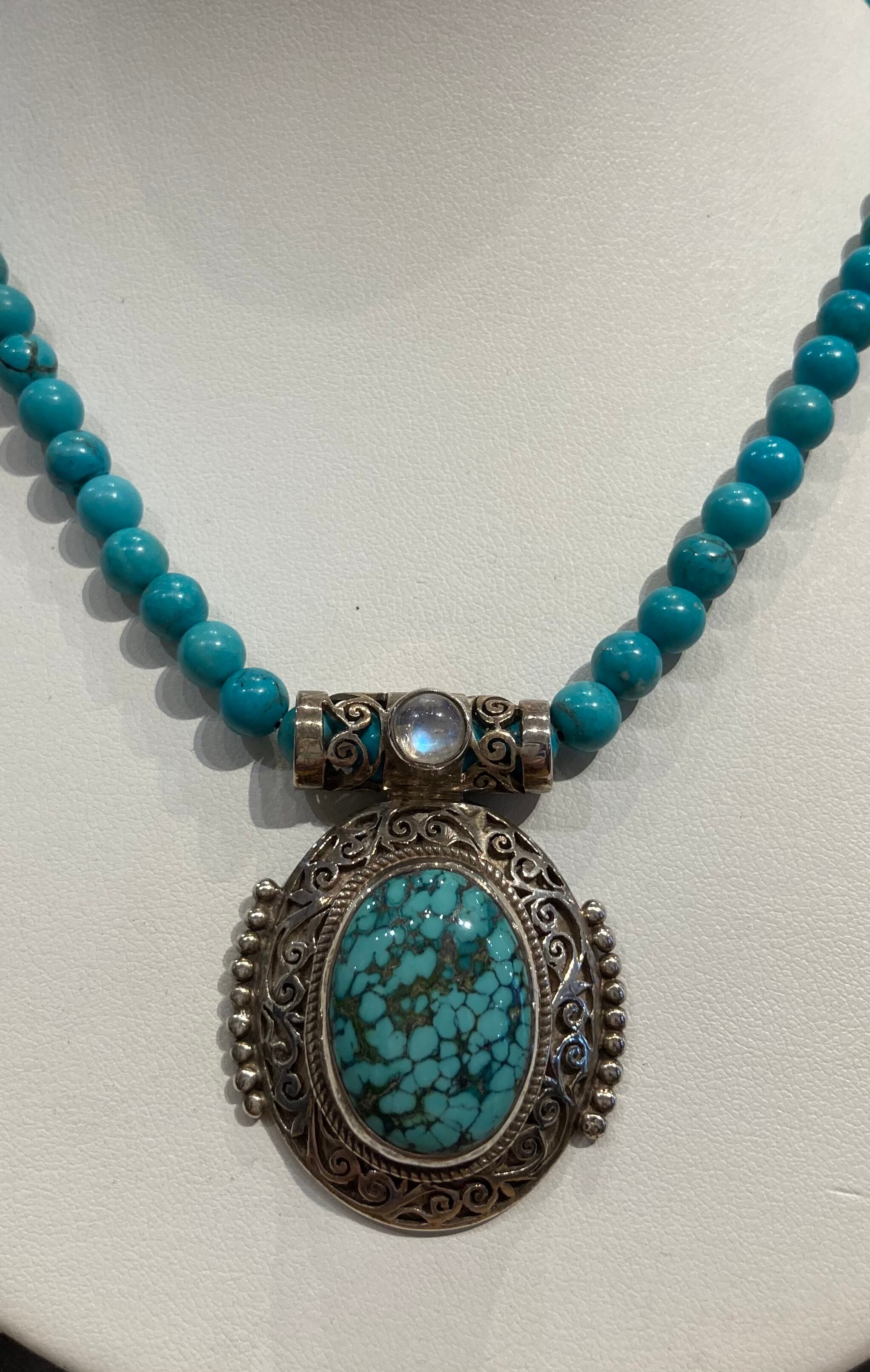 ターコイズ上部に小さなレインボームーンストーンが付いています